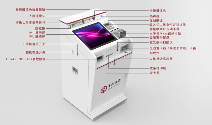 本产品采用简洁、明亮的设计风格,对各功能区加以区分,整机尺寸采用最小原则,设计紧凑,良好的人机交互操作,具有友好、可信、安全、科技的综合应用属性。机身上设有全景摄像头,集激光条码扫描,二代身份证、指纹扫描,电子签名、电动发卡读卡等功能于一体,切实根据用户的需要订制带有不同功能的机器。